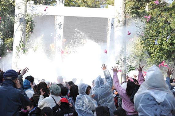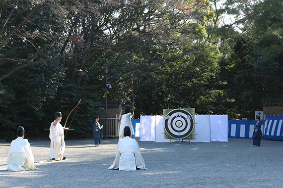 豊年と除災とを祈る神事で、午後1時より神楽殿前庭で斎行しております。俗に「御的(おまとう)」ともいわれ、大勢の拝観者がおとずれます。