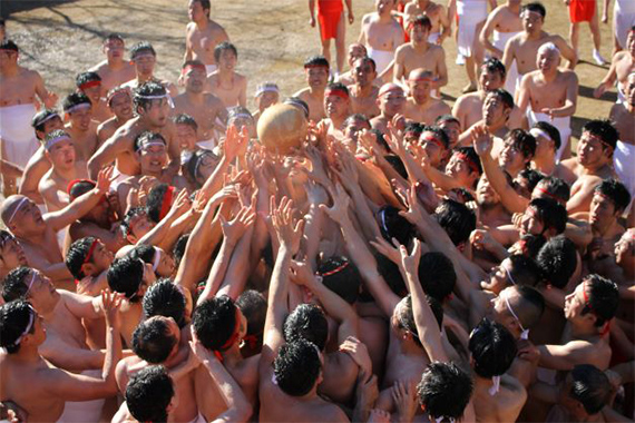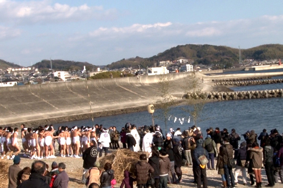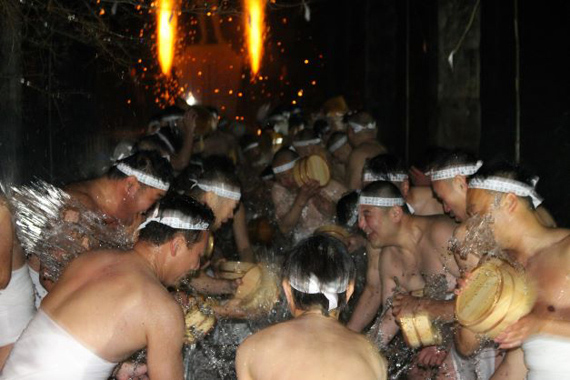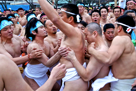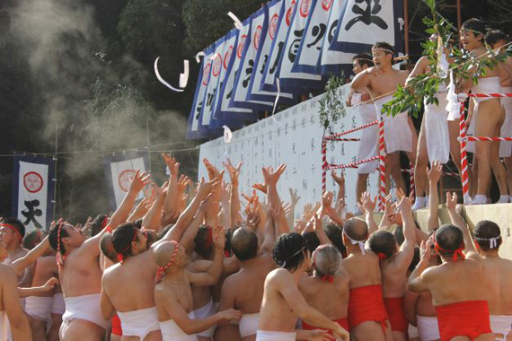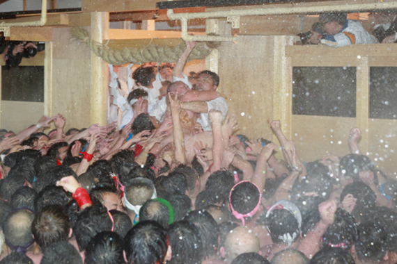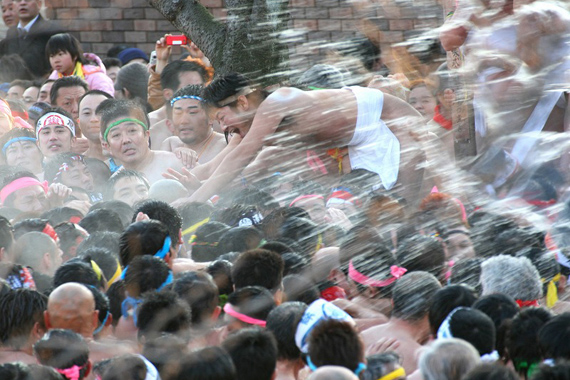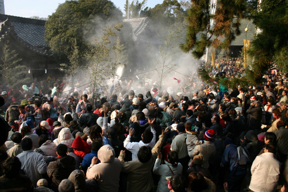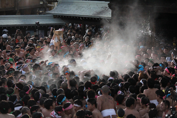 「国府宮のはだか祭」として知られるこの祭は、祈祷と神籖によって選ばれた一人の儺負人(神男)を巡って、裸男達による肉弾相打つ壮絶な揉み合いを繰り広げるものです。これは、神男に触れれば厄落としができるとの信仰からです。又、当日は早朝から厄除けの御祈祷を受ける人と、御守りの「なおいぎれ」等を受ける人で雑踏し、午後には裸男の集団が、裸になれない老若男女が厄除けの祈願を込めた布を結び付けた「なおい笹」を捧げて威勢よく拝殿へ駆け込んでいく姿が見られます。