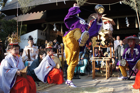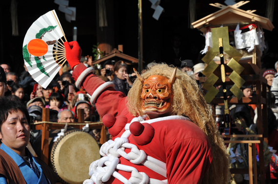 祭礼は二日間に亘り、氏子14町会によって神楽・田楽・歩射・卜占・御神幸など様々な行事が行われますが、ことに知られるのが「天狗と赤鬼のからかい」です。荒ぶる神である赤鬼と武神天狗が双方秘術を尽くして闘い、やがて敗れた赤鬼が償いにタンキリ飴と白い粉(小麦粉)をまきながら境外へ飛び去ります。この粉を浴び、飴を食べると厄除となり夏病みせぬと古来言い伝えられます。