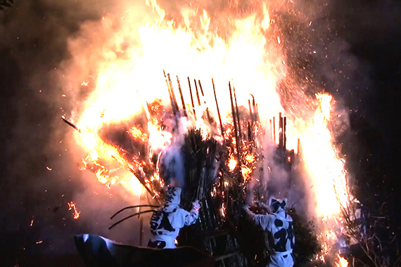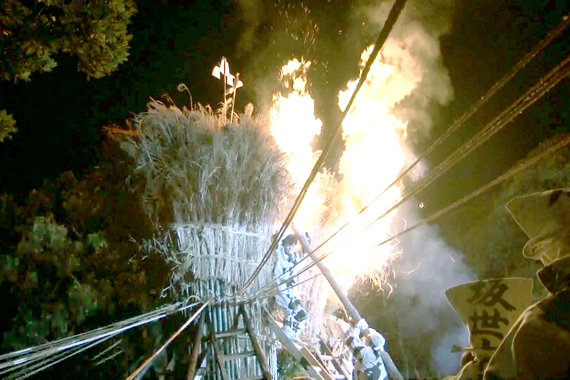 竹と茅で作った高さ5mの「すずみ」に火がつけられ、「福地」と「乾地」のふたつの地区に分かれた、神男と古いのぼりで作った衣装を纏った奉仕者たちが燃え上がる炎の中に勇敢に飛び込み、神木と十二縄を競って取り出し神殿に供えます。 「すずみ」の燃え具合と「福地」「乾地」の勝敗によって、その年の天候・豊凶を占います。