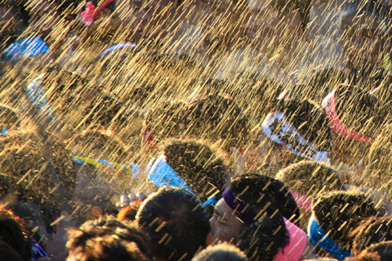 最後の矢が射られたと同時に拝観者が一斉に大的を目指して押しかけ、これを奪い合いますが、特に大的の千木(ちぎ:大的に付した木片)は古くより魔除けの信仰があり、的の細片までも得ようと人々の争うさまは壮観です。