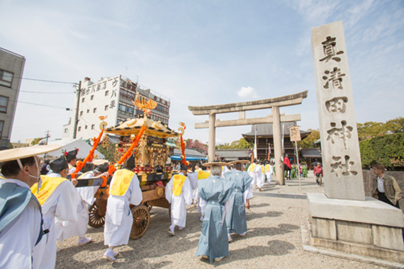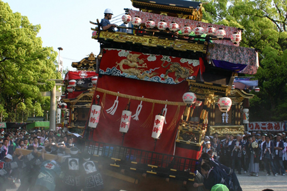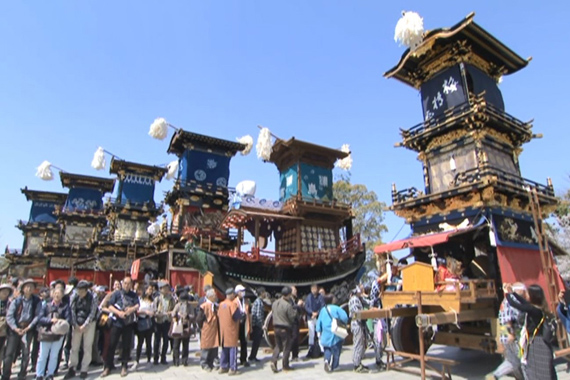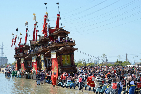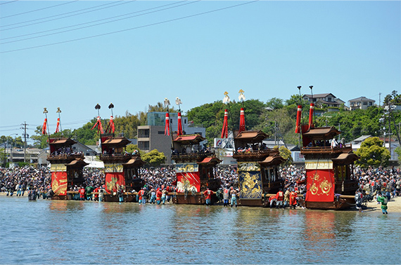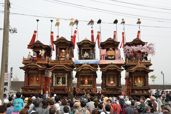 潮干祭は、300年以上も続くといわれる神前神社の祭礼で、祭神である神武天皇が海よりこの地に上陸したという伝説にちなみ、5輌の山車を潮干の浜へ曳き下ろしたことから、この名がついたといわれています。豪華な刺繍幕や精緻な彫刻で装飾された見事な山車とその山車を豪快に曳き廻す男衆の熱気と興奮、鳴り響くお囃子の調べと威勢のよい掛け声などとても勇壮な祭りです。
