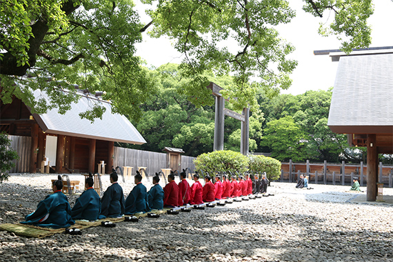 天皇陛下のおつかいである勅使が参向される、熱田神宮で最も重要で荘厳な祭り。境内では武道や芸能等数多くの神賑行事が奉納される。夕方には献灯まきわらに明かりが灯され、神宮公園から花火が1,000発も上がります。夏の訪れを告げる祭りとして、市民に広く親しまれています。