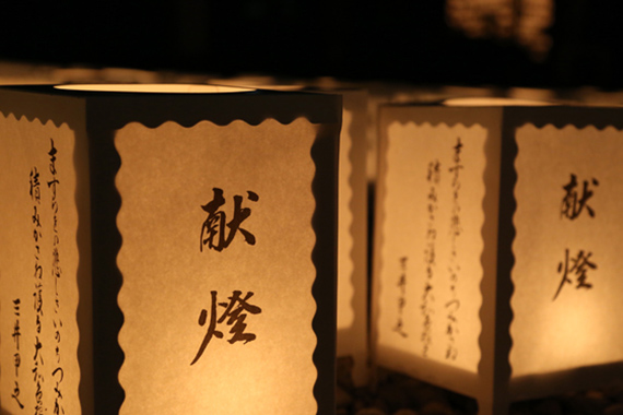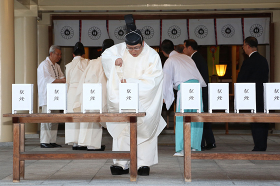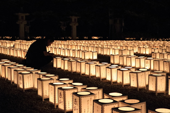 献燈祭は、御英霊へ感謝の誠を捧げるため、雪洞を設置・点燈し、お祈りするものです。午後6時、「御神火授与点燈式」を執行。御社殿での祭典後、奉仕者の手により御神火を境内一面の雪洞に点燈します。浄闇を照らす、燈火は正に御英霊の囁きとも感じられ、ご遺族が手を合わせる姿は、広く参拝者に感銘を与え、御英霊の遺徳を顕彰し、平和の尊さを伝えています。